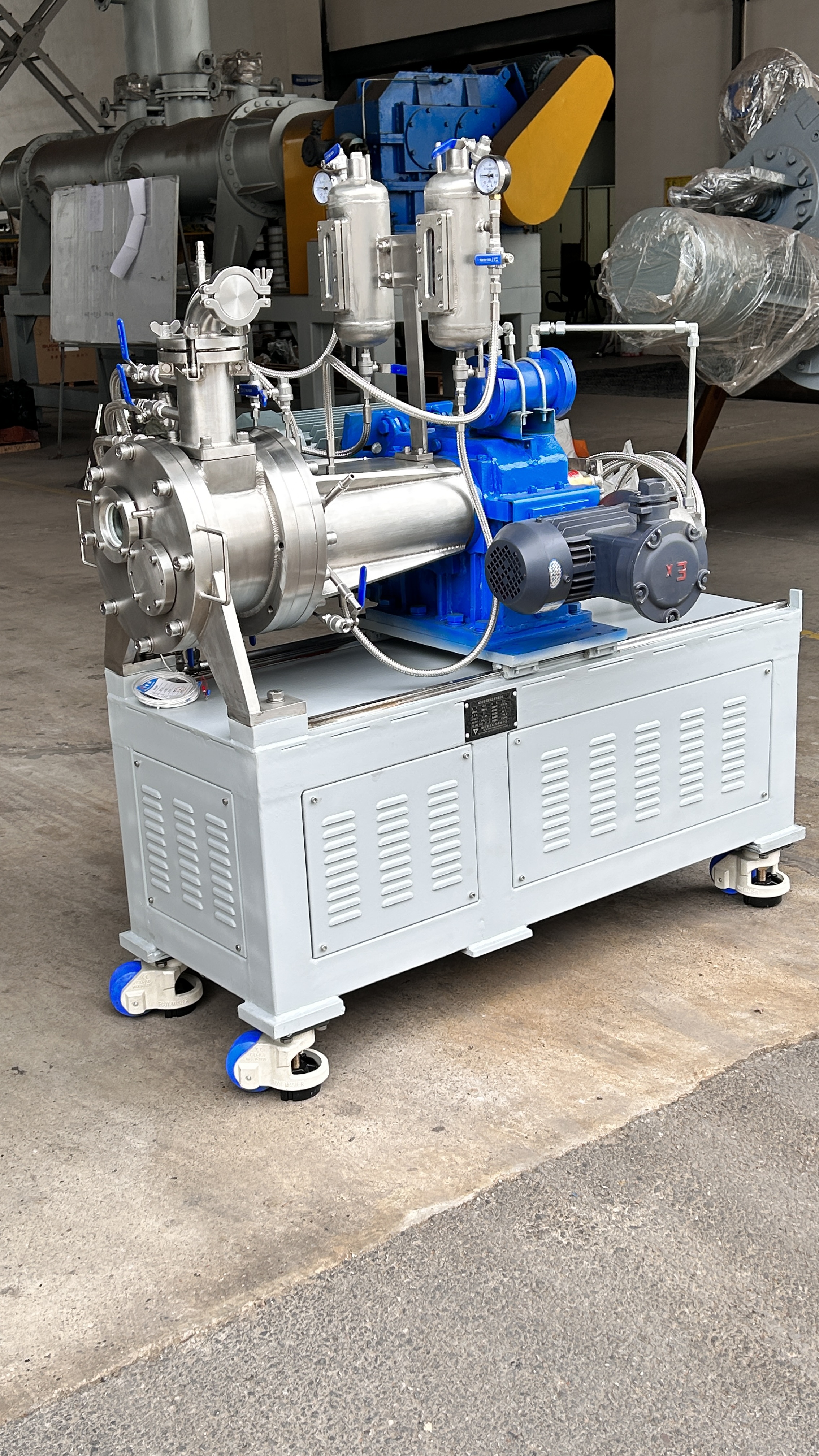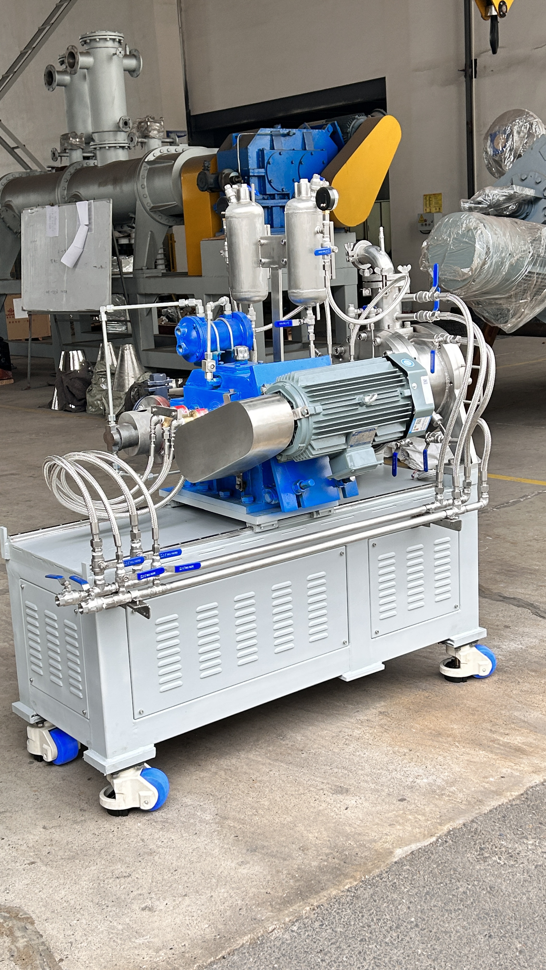 為了適應(yīng)在真空狀態(tài)下的操作,專門安裝了適用于高粘度物料的齒輪泵式出料器。該出料器直接安裝在主設(shè)備上,消除了設(shè)備內(nèi)的死角。齒輪泵式出料器在稍微超負(fù)荷的條件下工作,以保證物料能連續(xù)地排出,并輸入下一工段進(jìn)行包裝。