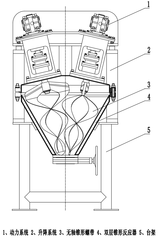 雙錐體無軸螺帶混合裝置,雙層錐形殼體是為了調節(jié)反應或混合溫度,在錐形反應皿的外部 增加一個內部中空的夾套用于通過熱媒或冷媒介質,從而對錐形反應皿進行溫度調節(jié)。