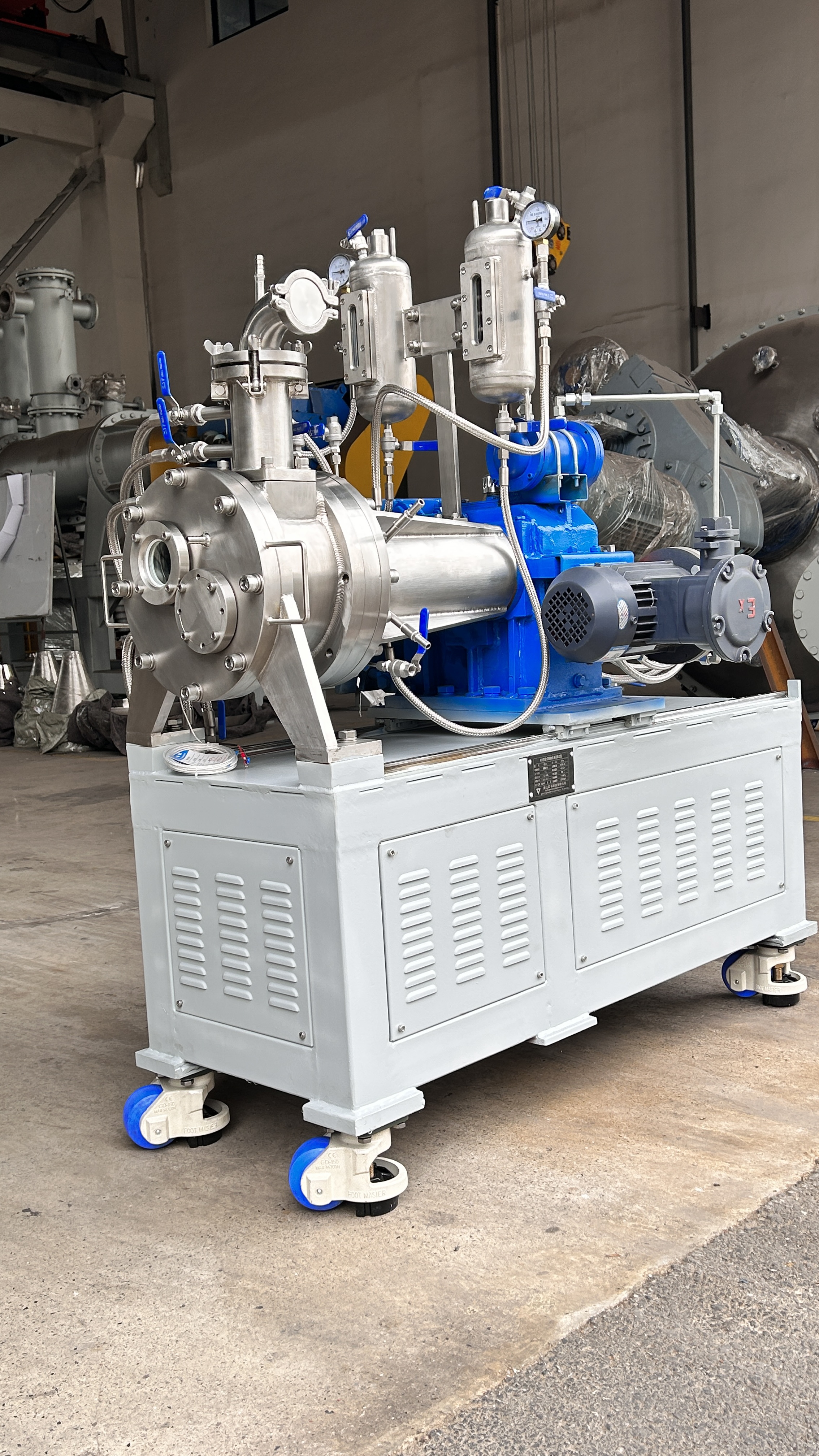 為了適應(yīng)在真空狀態(tài)下的操作,專門安裝了適用于高粘度物料的齒輪泵式出料器。該出料器直接安裝在主設(shè)備上,消除了設(shè)備內(nèi)的死角。齒輪泵式出料器在稍微超負(fù)荷的條件下工作,以保證物料能連續(xù)地排出,并輸入下一工段進(jìn)行包裝。